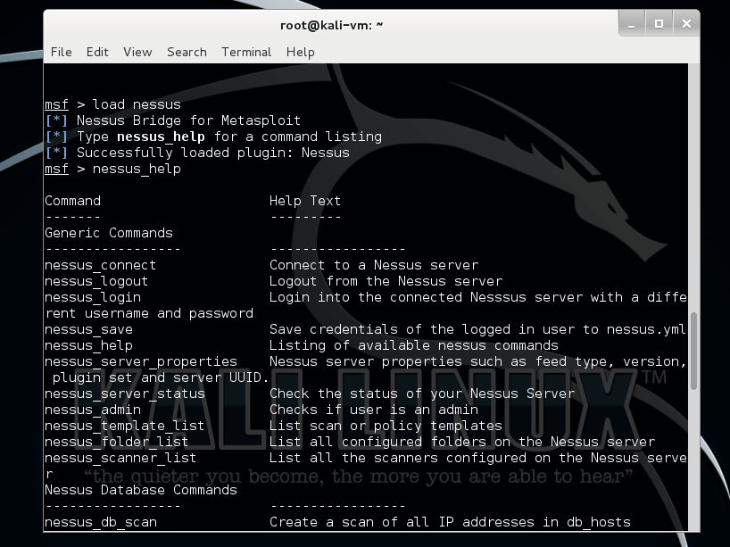 Running nessus_help will display the msfconole commands now available to us. As you can see, it is quite full-featured.