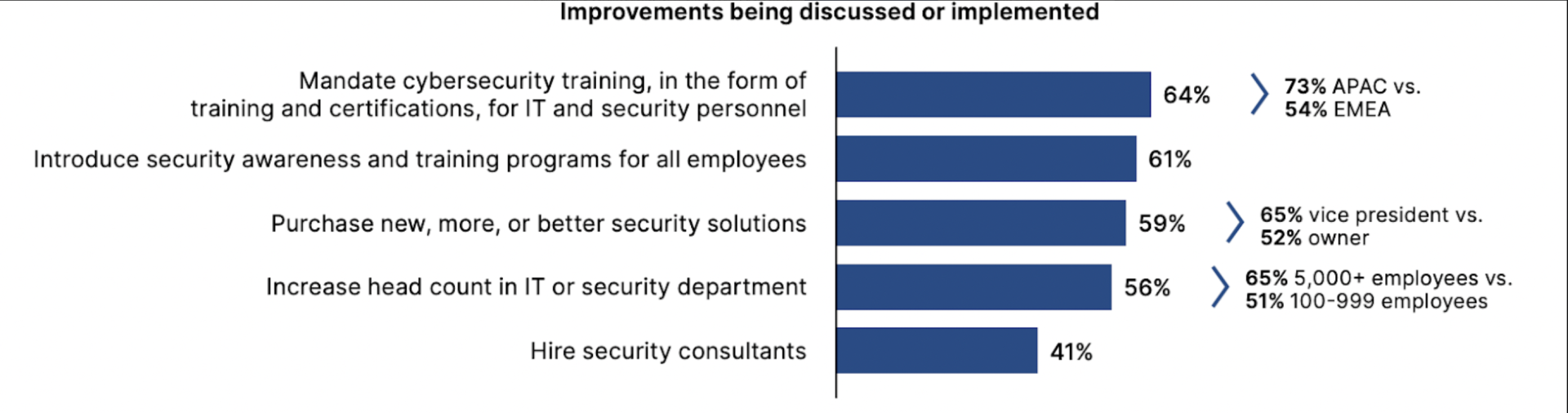 Nearly three-quarters (72%) of boards increased their focus on cybersecurity in 2023, implementing measures such as mandatory cybersecurity training for IT staff (64%), security awareness programs for all employees (61%), and investing in better security solutions (59%). Additionally, 97% of boards now consider cybersecurity a business priority and 56% have discussed increasing IT/security staff.