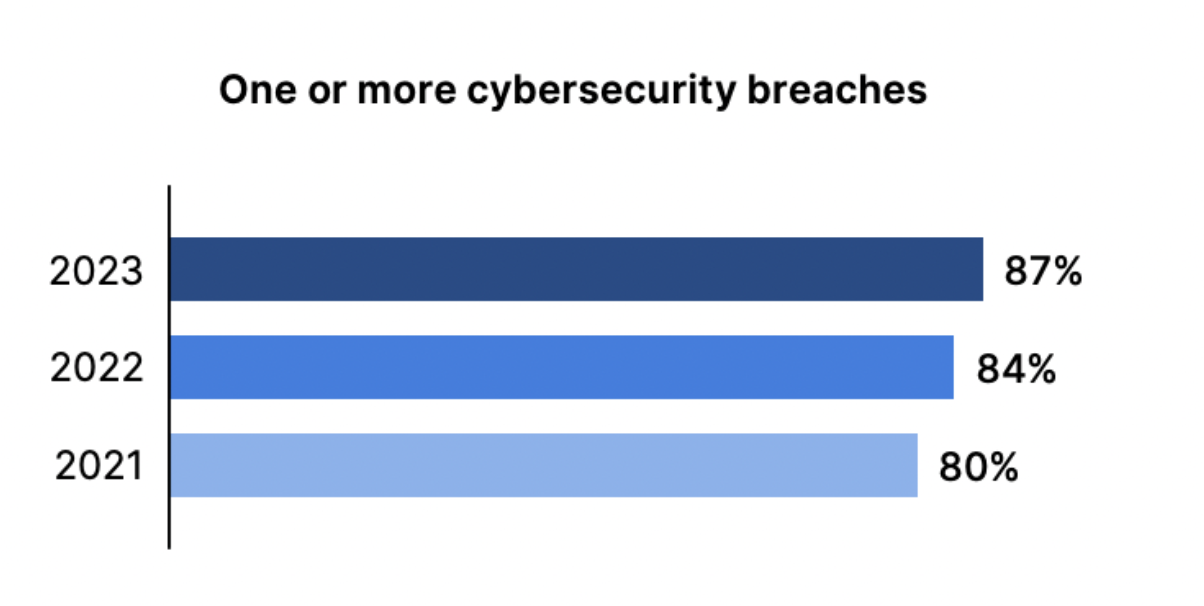 In 2023, 87% of organizations faced one or more security breaches, and over half suffered financial losses exceeding $1 million, a troubling increase from previous years.