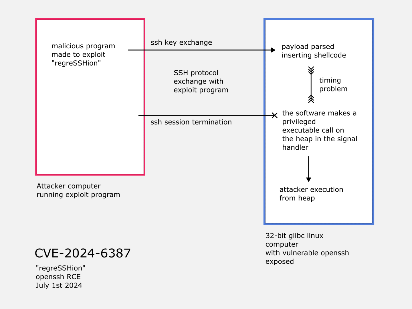 This exploit works because a signal handler in OpenSSH exposes an opportunity for some glibc Linux distributions to insert instructions into the heap at the same time privileged execution is taking place. This works by identifying the location in the heap to insert the malicious payload, doing a fake key exchange process to get the payload parsed, then doing a timing attack to modify the heap at the exact moment the privileged execution occurs, swapping in the malicious action.