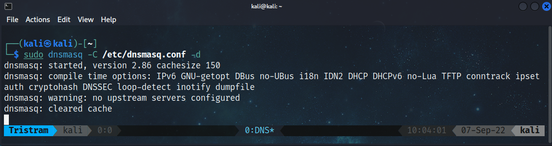 Things are looking good enough for us to try to start up our server. Instead of enabling Dnsmasq as a service, we’ll manually run Dnsmasq with the -C and -d parameters to declare the path to our config file and instruct it to run in debug mode. Running Dnsmasq in debug mode helps us out by being able to see DNS requests/replies as well as any errors that may occur for troubleshooting from the terminal.