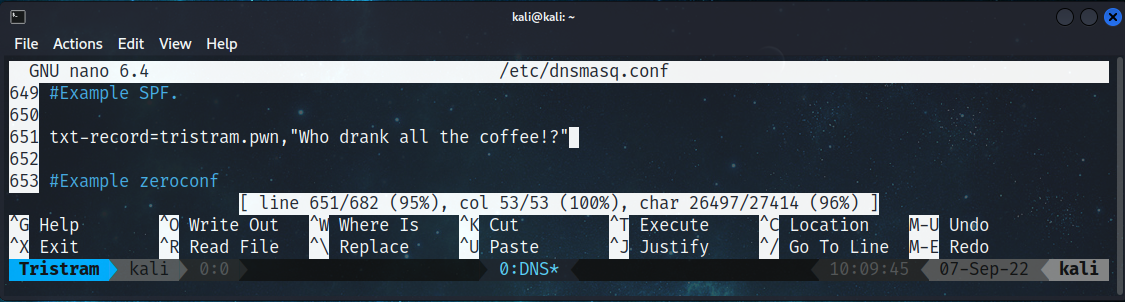 In order to add a TXT record to our Dnsmasq instance, we’ll need to add them to our config file. An example of a TXT record already exists in our conf file, starting with #txt-record=.