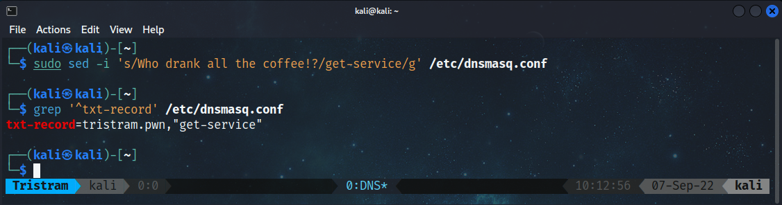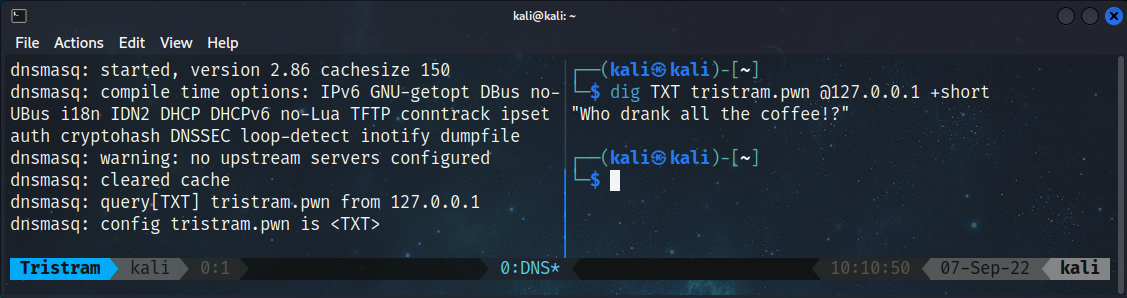 After we add the new setting, we’ll need to restart our Dnsmasq instance and use dig again to retrieve the TXT record for tristram.pwn. If we look back at our terminal running Dnsmasq we’ll also see the query and response that was sent back to the client.
