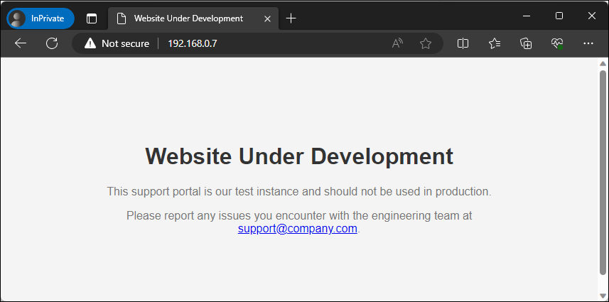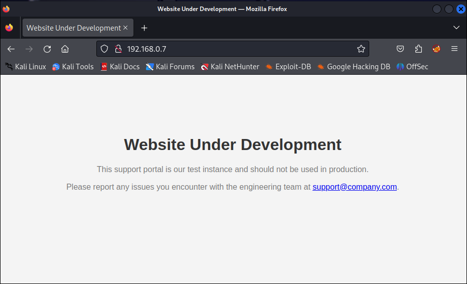 - A development/test system has been made accessible to the internet that contains an email address on the landing page