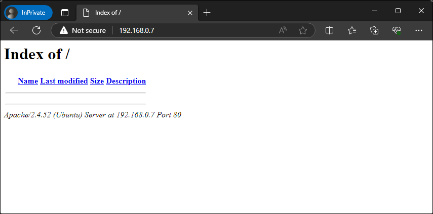 http://192.168.0.7 [200 OK] Apache[2.4.52], Country[RESERVED][ZZ], HTTPServer[Ubuntu Linux][Apache/2.4.52 (Ubuntu)], IP[192.168.0.7], Index-Of, Title[Index of /]