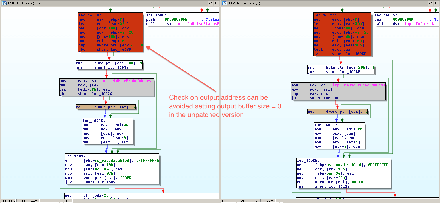 After downloading the patch from the Microsoft website, we extracted it, decompiled the afd.sys driver, and ran a diff on an unpatched version. The results of our diff showed that only the AfdJoinLeaf function was changed: