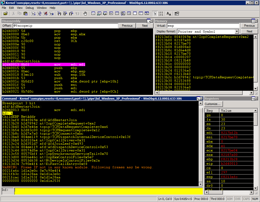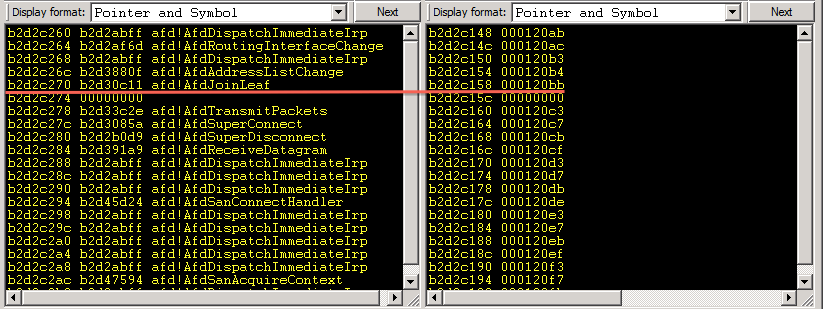 In analyzing the vulnerable AfdJoinLeaf function, we determined that it could be triggered by sending a specific IOCTL (0x120bb) to the afd driver: