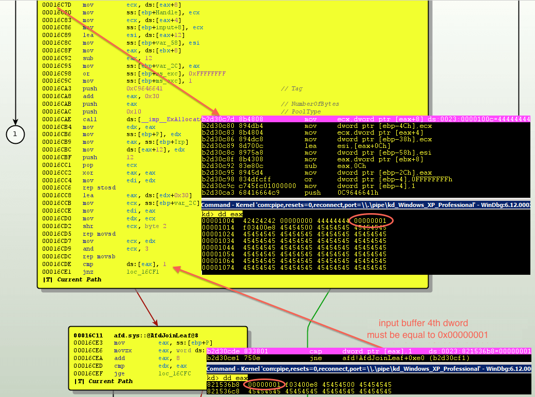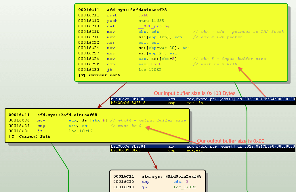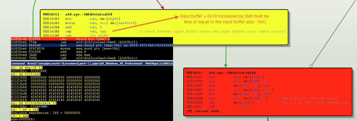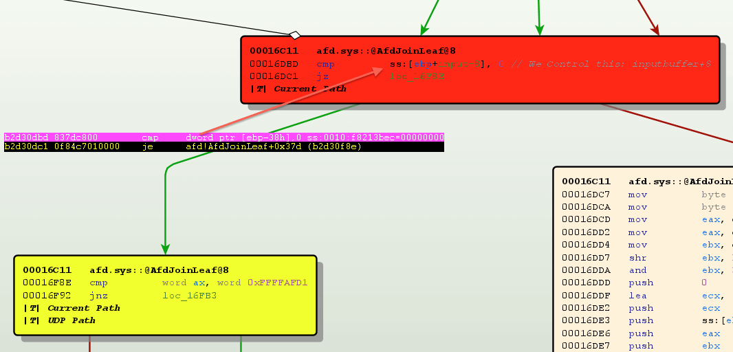 AfdConnectApcKernelRoutine will try to write a NTSTATUS code in the IRP output buffer. In order to reach AfdRestartJoin, we once again need to take a couple of branches in the right direction, beginning with the branch at 0x00016DBD. The stack variable input+8 must be equal to 0x00000000: