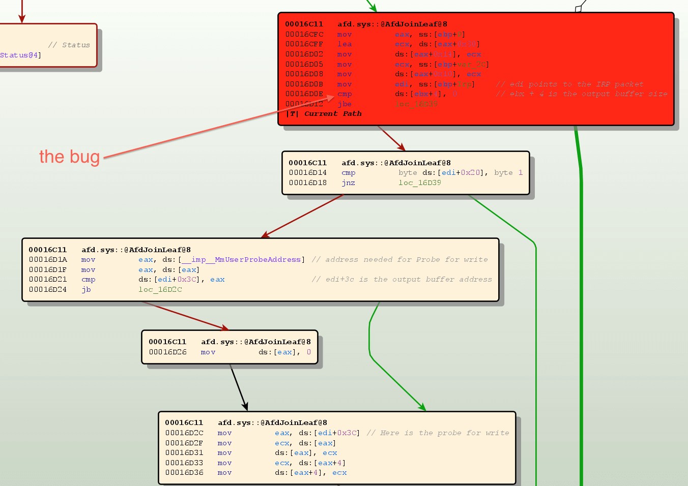 However, in the AfdJoinLeaf function, there doesn’t seem to be an obvious way to trigger the pointer overwrite. One possible path is to craft our attack to reach the call to AfdRestartJoin in the basic block at 00016F54: