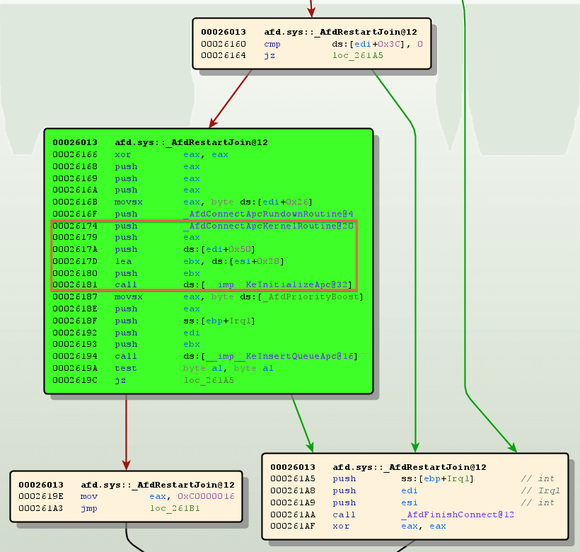 Following along, AfdRestartJoin calls AfdConnectApcKernelRoutine as expected: