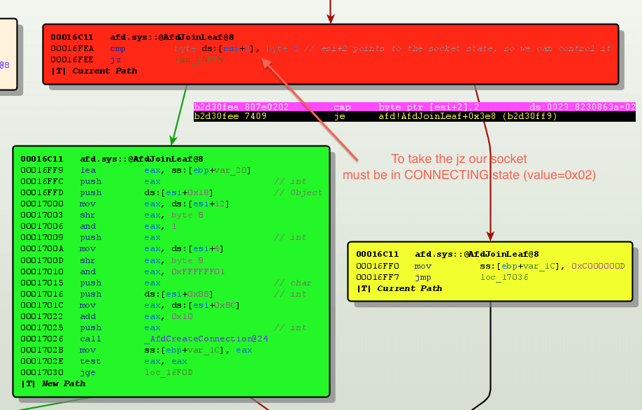 In the branch at 0x00016FEA, the socket state is checked. We need to have a TCP socket in the CONNECTING state (0x2) in order to take the jump and get to AfdRestartJoin: