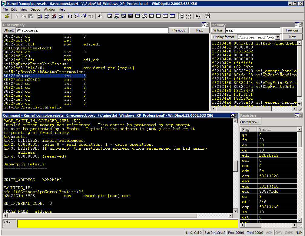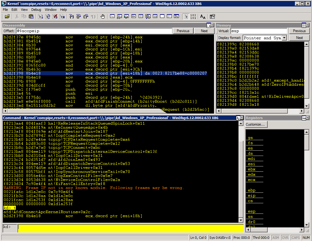 Not surprisingly, this invalid address causes AfdConnectApcKernelRoutine to crash while trying to write an NTSTATUS code (STATUS_INVALID_ADDRESS_COMPONENT) to the provided address: