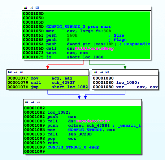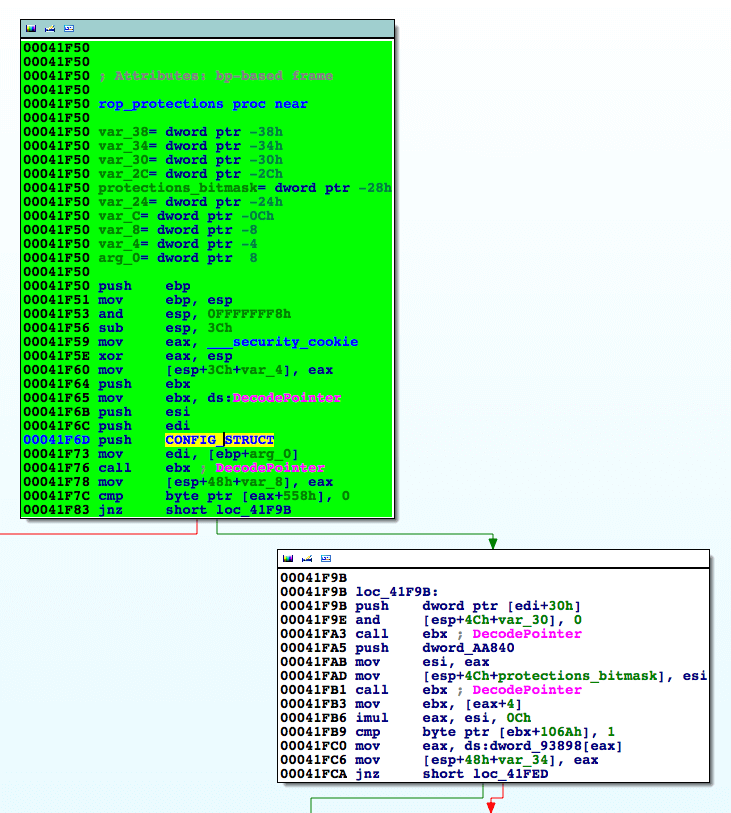 The very first thing that we noticed is that the global variable we exploited to disarm the ROP Protections (ROP-P) routine is not pointing directly to the ROP-P general switch anymore. This variable, which is now at offset 0x000aa84c from the EMET.dll base address, holds an encoded pointer to a structure of 0x560 bytes (See CONFIG_STRUCT in Fig. 1). The ROP-P general switch is now located at CONFIG_STRUCT+0x558 (Fig. 1, Fig. 2).