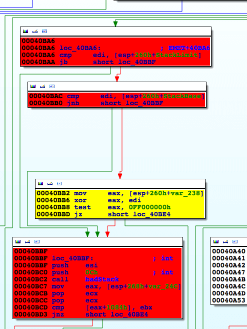We were able to verify this by setting a breakpoint at EMET+0x40BA6 (Fig. 3), which is a basic block belonging to the EAF/EAF+ ExceptionHandler (EMET+0x4084A) installed by the toolkit.