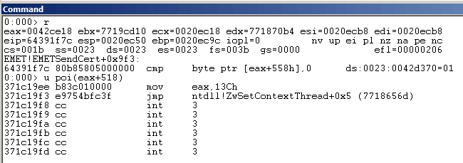 Since we have already disarmed EMET ROP mitigations as well as DEP/ASLR at this point, we were able to bypass the stack registers check executing the following instructions just before resolving NtSetContextThread: