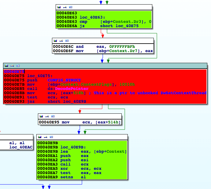 This discovery made us even more curious and we started to snoop around the entire structure. We saw that at specific static offsets from the beginning of the structure, you can find pointers to respective stubs for all the hooked Windows APIs: