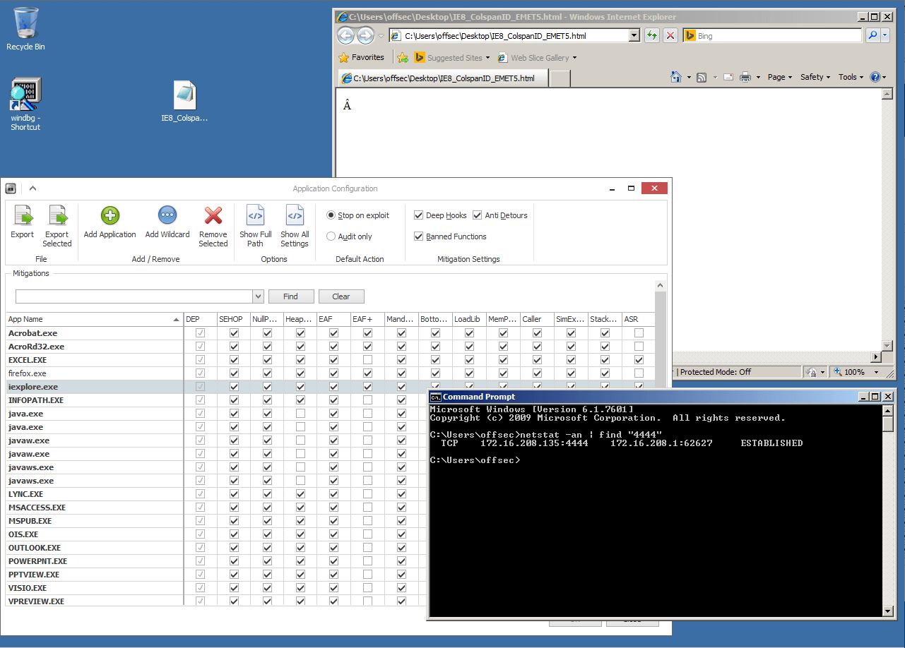 “Unfortunately”, the hook eventually calls into the ROP-P routine, and since all the checks are already disarmed by the previous ROP chain, it is completely ineffective. The result is that no further changes to the shellcode were needed to bypass EMET 5 with all of its mitigations enabled except for EAF+. By resolving and calling NtSetContextThread, we were once again able to bypass EAF and successfully obtain a remote shell.