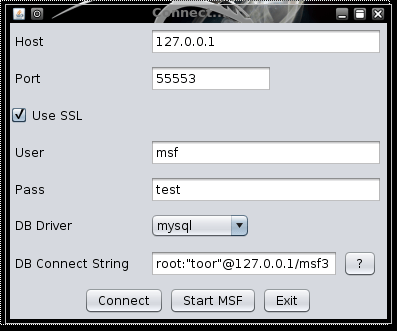 When Armitage first launches, we are prompted to connect to the msfrpcd instance and our MYSQL database as shown below. We verify our settings, select Use SSL, and click Connect.
