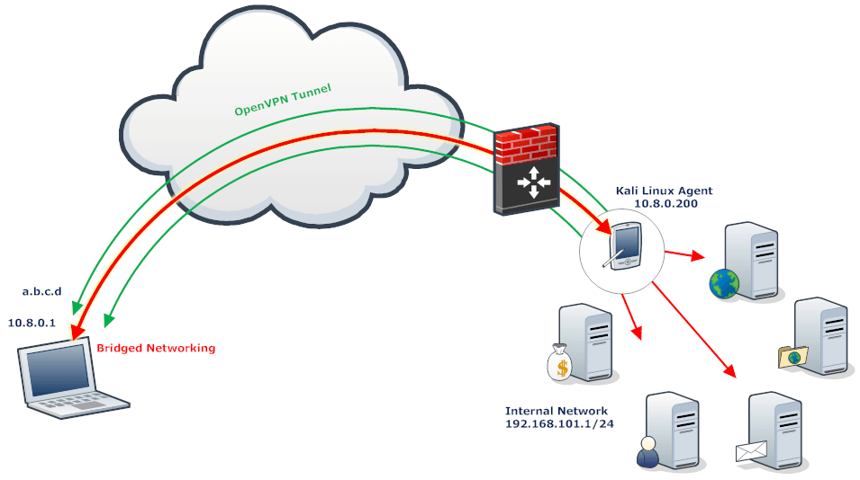 The idea we had was to build an “unattended self-deploying” instance of Kali Linux that would install itself on a target machine along with a customized configuration requiring no user input whatsoever. On reboot after the installation completes, Kali would automagically connect back to the attacker using a reverse OpenVPN connection. The VPN setup would then allow the attacker to bridge the remote and local networks as well as have access to a full suite of penetration testing tools on the target network.