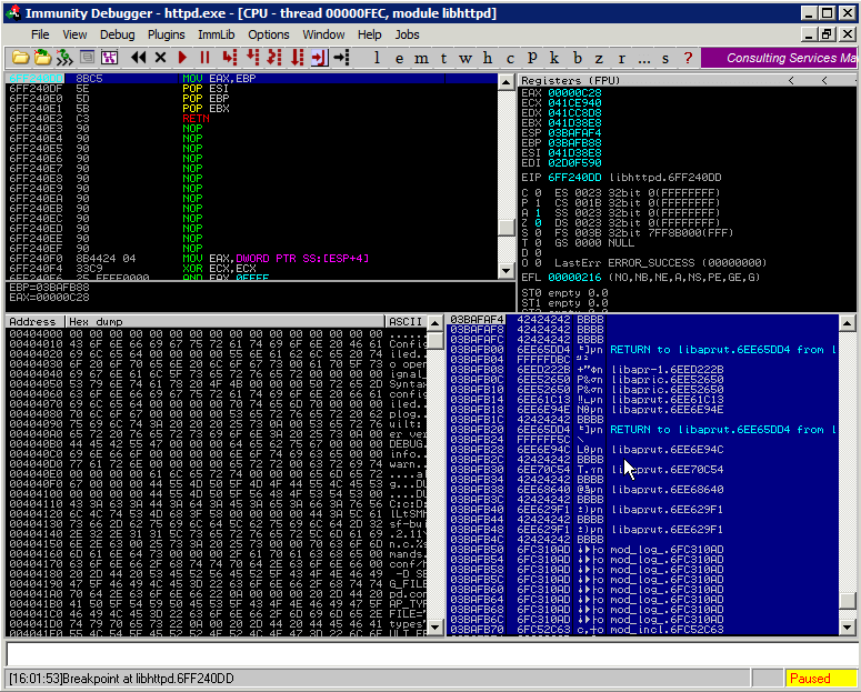 We started working on the Pr0T3cT10n POC – trying to see if we could get a shell on Win2k8….So we fired ID, crashed Apache and started inspecting the crash, analyzing loaded DLLs to see if any of them were ASLR disabled.