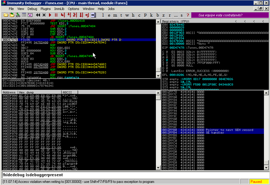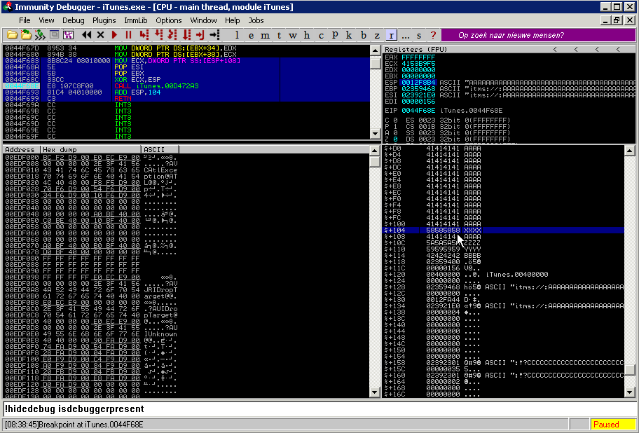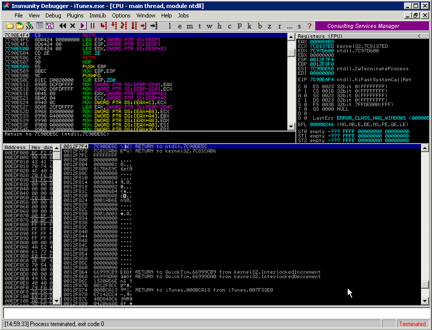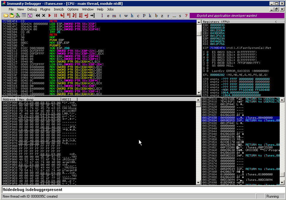 After attaching a debugger to the iTunes process, we noticed it was getting terminated after around 30 seconds. It looked like iTunes had anti-debugging features implemented. Fortunately, Immunity Debugger offers anti-debugging scripts which are useful for situations just like this. Invoking the !hidedebug command within ID allowed the debugger to continue running in hidden mode, bypassing our first hurdle.