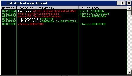 Using the OSX exploit as a template, we attempted to crash iTunes several times, however the process would keep terminating with no opportunity for code redirection. After inspecting the call stack in one of the crash cases, we saw that one function was calling ZwTerminateProcess.